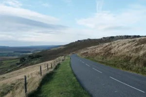 Cycling past Stanage Edge